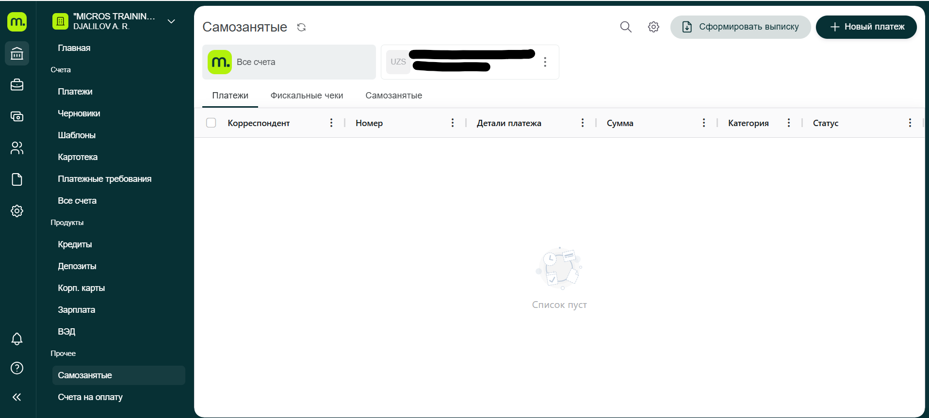 Эта страница предназначена для управления платежами самозанятых пользователей. Здесь можно просматривать и управлять платежами, создавать новые платежи и получать выписки.