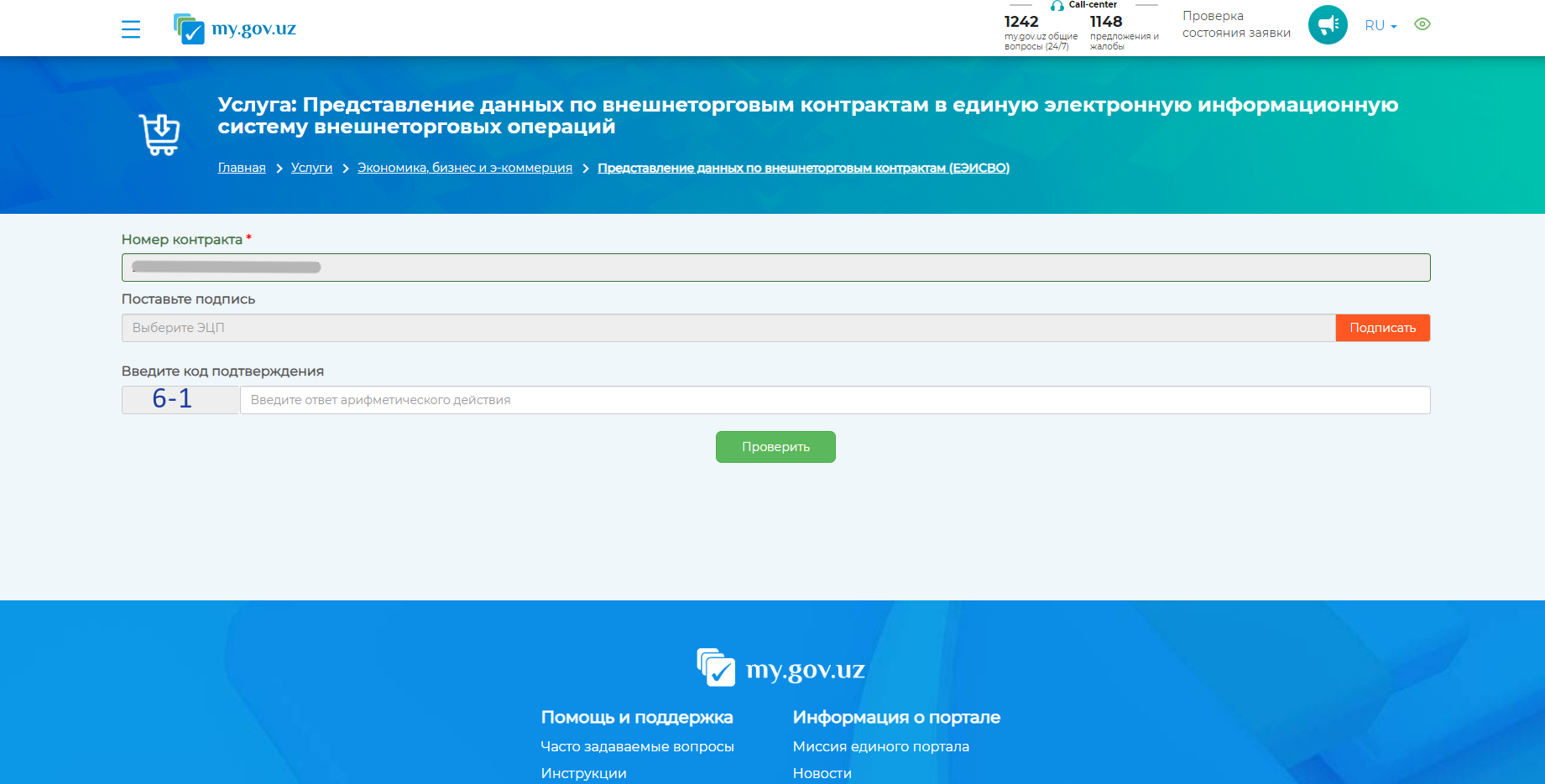 - При нажатии на контракт, открывается новая вклада на my.gov.uz, сайт представляет данные по внешнеторговым контрактам в единую электронную информационную систему внешнеторговых операций.
