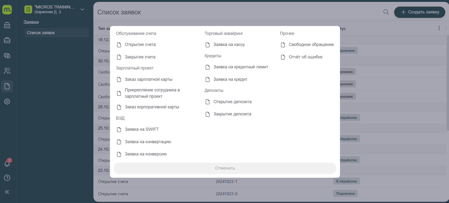- Зайдите в раздел "Заявки" и нажмите "Создать заявку" в правом верхнем углу.