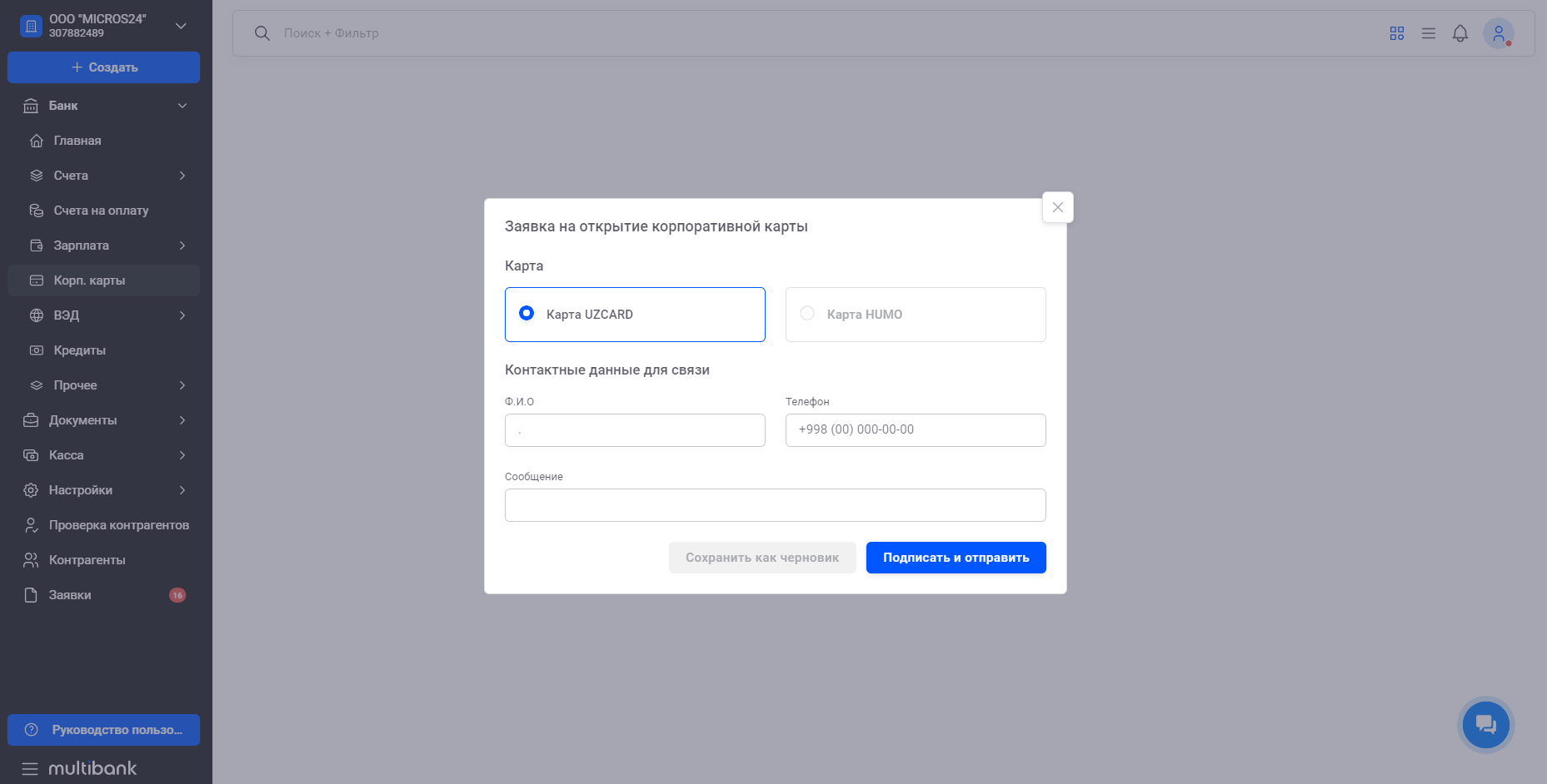 - В разделе "Корп. карты" нажмите на "Создать" в левом верхнем углу.