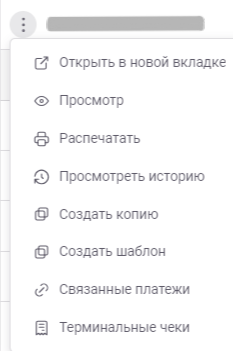 • Нажав на три точки слева каждого платежа, можно открыть платеж в новой вкладке, распечатать его, просмотреть историю, связанные платежи и терминальные чеки. На определенных платежах, вы можете также создать копию или шаблон платежа.