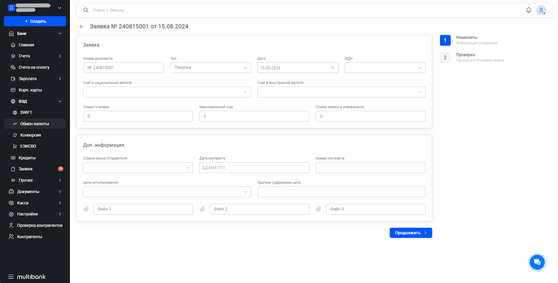 • Чтобы создать новую заявку, нажмите на "Создать" в верхнем левом углу, заполните реквизиты, проверьте введенную информацию и нажмите на "Подписать и отправить".