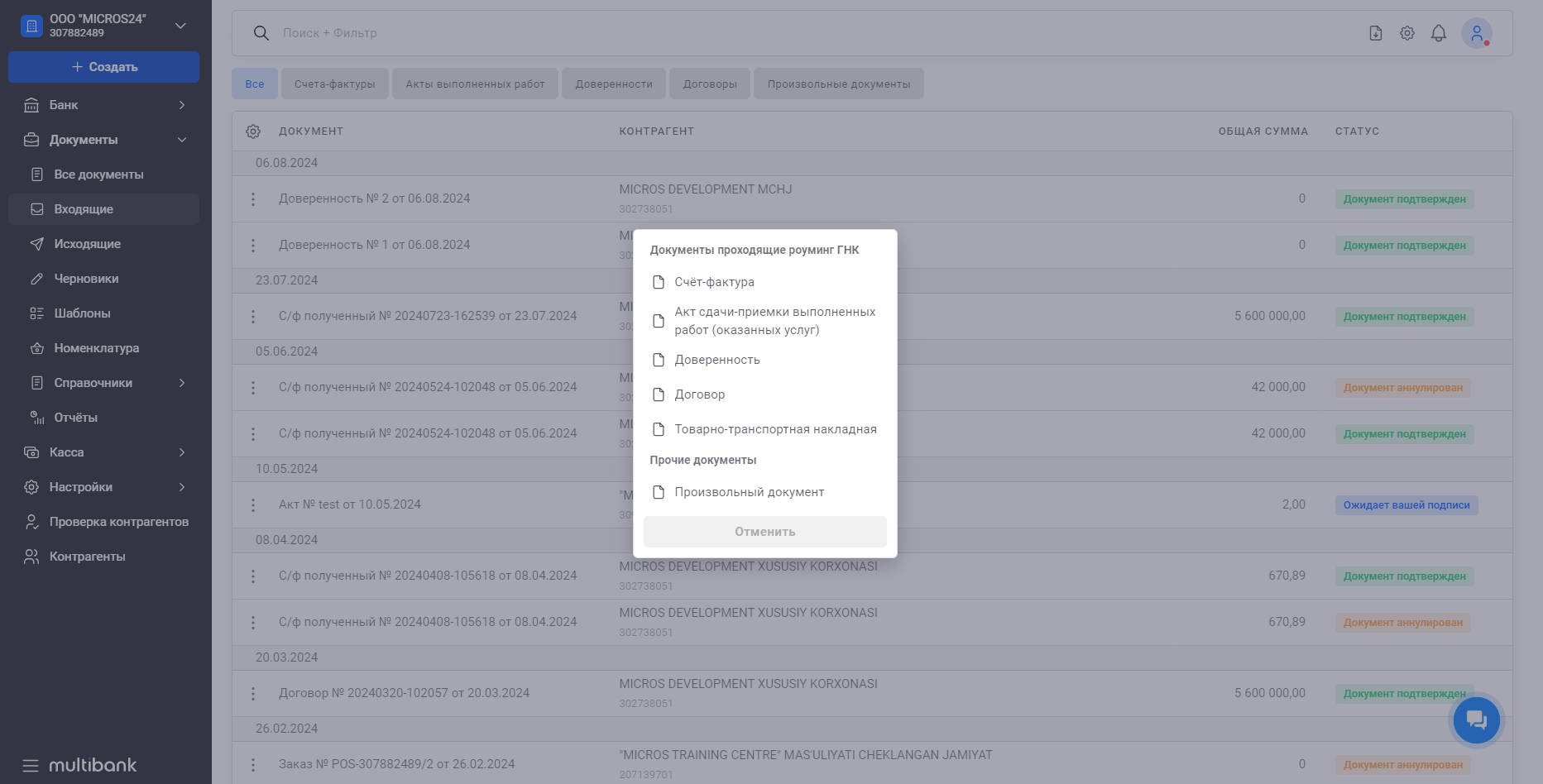 • В разделе "Входящие" находятся все входящие счета-фактуры, акты выполненных работ, доверенности, договоры и произвольные документы