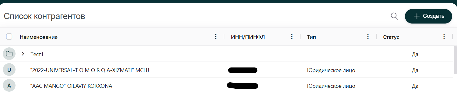 • Для поиска контрагента введите его имя или ИНН/ПИНФЛ в строку поиска.