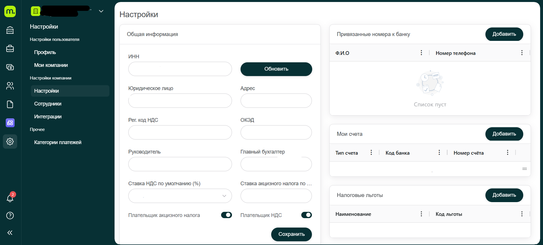 Страница "Настройки" предназначена для управления основными данными компании, такими как ИНН, юридическое лицо, адрес, банковские счета, и налоговые льготы.